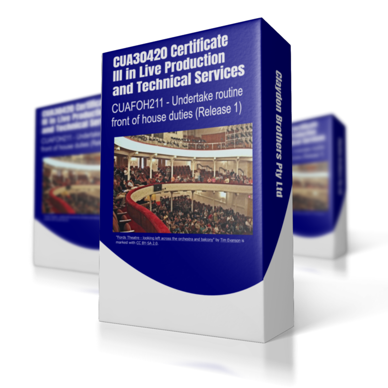This unit describes the performance outcomes, skills and knowledge required to undertake routine front of house duties for shows and performances in the screen, media, entertainment and events industries. It involves identifying and preparing for front of house work activities, completing these tasks according to organisational policies and procedures and reviewing one’s own work performance.